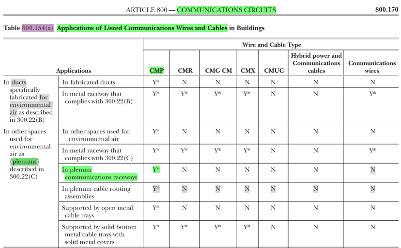 💬 NEC 800.154(a) 표에 따르면, 금속 전선관이나 케이블 트레이 없이도 설치가 허용되는 유일한 통신 케이블은 CMP 타입입니다.