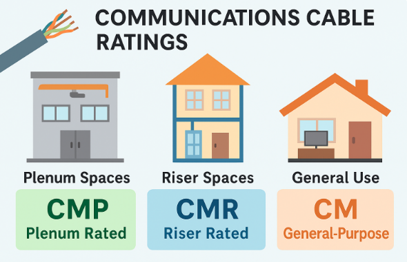| ✅ Riser 등급 | CMR | Communications Riser-rated | 층간 통로(수직 샤프트, 계단실) | 상당히 안전함🔥🔥 |