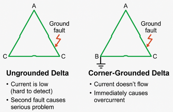 | 비접지 델타 (Ungrounded Delta) | 지락 시 운전 지속 가능, 고장 감지 어려움, 고전압 지속 위험 |