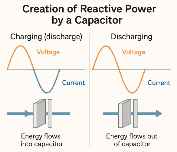 - 캐패시터는 전류가 전압보다 앞서는 성격이라, 모터가 필요로 하는 Q를 근처에서 공급해 줍니다.
