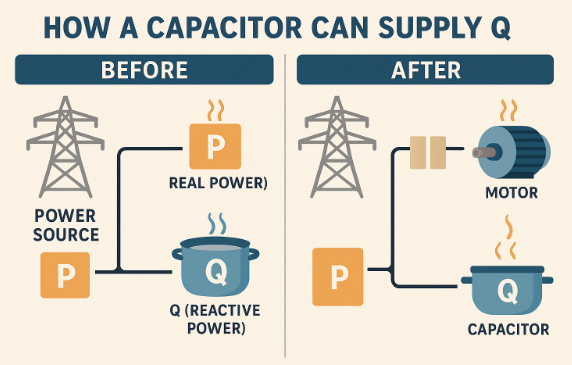 “캐패시터가 어떻게 Q(무효전력)를 대신 만들어 주는지” 쉽게 설명해 드릴게요.