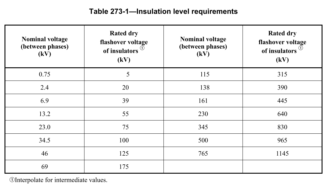 The rated dry flashover voltage of the insulator or insulators, when tested in accordance with ANSI C29.1-1988 (R2012), shall be not less than that shown in Table 273-1,