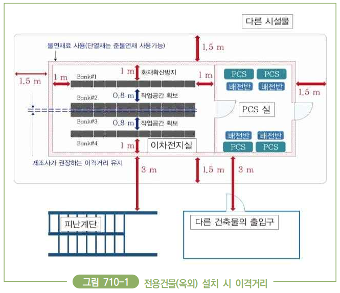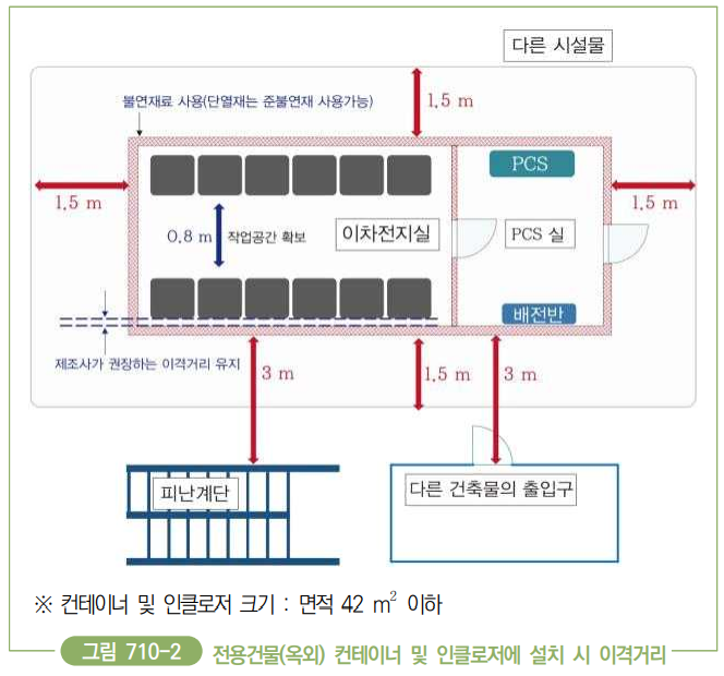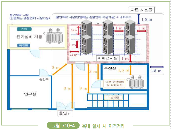 | 710.2 리튬계ㆍ나트륨계 이차전지의 시설 710.2.1 적용범위 20 kWh를 초과하는 리튬ㆍ나트륨 계열의 이차전지를 사용한 전기 저장장치의 시설기준에 적용한다. 710.2.4 전기저장장치 시설장소별 요구사항 710.2.4.1 전용건물에 시설하는 경우 전기저장장치를 일반인이 출입하는 건물에서 분리된 별도의 장소에 시설하는 경우에는 다음과 같이 시설하여야 한다. 1. 바닥, 천장(지붕), 벽면 등의 재료는 표 710-1 「건축물의 피난· 방화구조 등의 기준에 관한 규칙」에 따른 불연재료로 시설할 것. 다만, 내부단열재는 표 710-1에 따른 준불연재료 또는 이와 동등 이상의 것을 사용할 수 있다. ![]() 8. 이차전지실은 이차전지 용량의 5 MWh 이하 단위로 「건축물의 피난‧ 방화구조 등의 기준에 관한 규칙」에 따른 내화구조의 격벽을 설치하여야 한다. ![]() ![]() 710.2.4.2 전용건물 이외의 장소에 시설하는 경우 전기저장장치를 일반인이 출입하는 건물의 부속공간(옥내)에 시설 (옥상에는 설치할 수 없다)하는 경우에는 710.2.4.1을 준수하고 다음과 같이 시설하여야 한다. 1. 전기저장장치 시설장소는 표 710-2 「건축물의 피난․방화구조 등의 기준에 관한 규칙」에 따른 내화구조로 설치하여야 한다. 2. 각 랙의 용량은 50 kWh 이하, 건물 내 이차전지의 총 용량은 600 kWh 이하로 시설하여야 한다. 3. 이차전지의 랙과 랙 사이는 1 m 이상 이격하고, 랙과 벽면 사이는 전면부의 경우 1 m 이상, 측면과 후면부의 경우 0.8 m 이상 이격 하여야 한다. 다만, 내화구조의 벽을 랙 상단 0.5 m까지 설치하고 좌·우는 랙 폭 넓이에 맞춰 설치(유지보수·냉각 등)하는 경우 랙과 랙 사이의 이격거리를 1 m 이상 유지하지 않아도 된다.(열과 열 사이는 1 m 이상 유지하여야 한다.) ![]() 4. 이차전지실은 건물 내 다른 시설(수전설비, 가연물질 등)로부터 그림 710-4와 같이 1.5 m 이상 이격하고 각 실의 출입구나 피난계단 등 이와 유사한 장소로부터 3 m 이상 이격하여 시설 하여야 한다. 비고 이차전지실과 전기저장장치의 전기설비계통(변압기, PCS 등) 간의 이격거리는 점검이 가능한 안전거리 이상을 확보하여야 한다. ![]() |