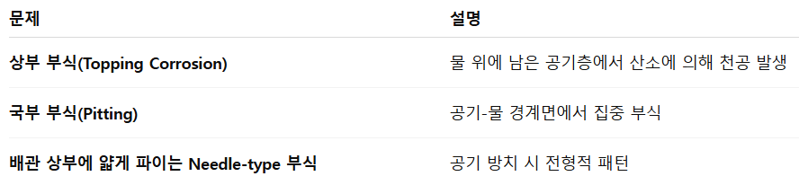 → 습식보다 국부적인 피팅(Pitting) / MIC 미생물 부식이 빠르게 진행됨