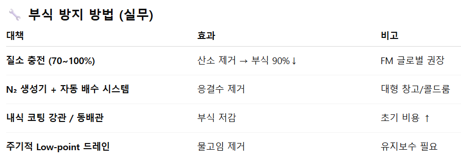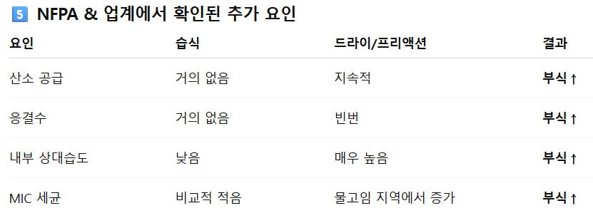 - 또한, FM Global의 부식 관련 보고서 FM Data Sheet 2‑1 (“Corrosion in Automatic Sprinkler Systems”) 에서는 “드라이·프리액션 시스템은 내부에 공기와 응결수 조건이 복합되어 부식 위험이 더 높다”는 기술이 있습니다.