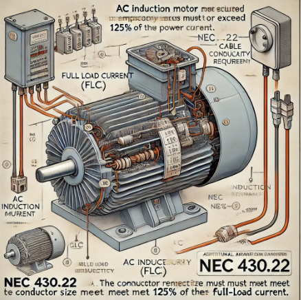 NEC 430.22(A) 규정에 따르면, 모터를 공급하는 전선의 최소 암페어 용량은 전부하 전류(FLC)의 125% 이상이어야 한다.