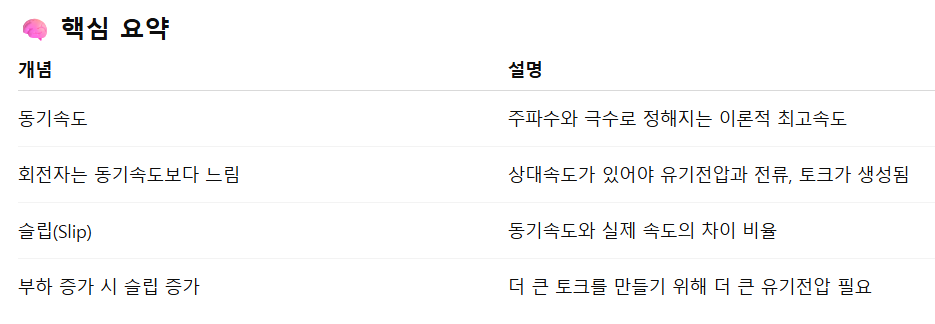 🔍 2. 유도전동기는 왜 반드시 동기속도보다 느려야 하는가?