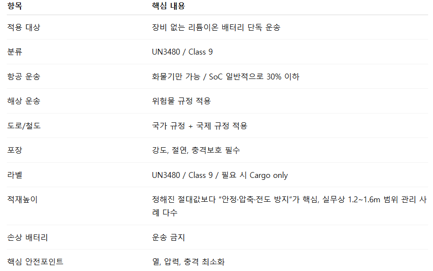 - 완전 충전(Full Charge) 상태의 배터리는 항공 운송이 거의 불가능