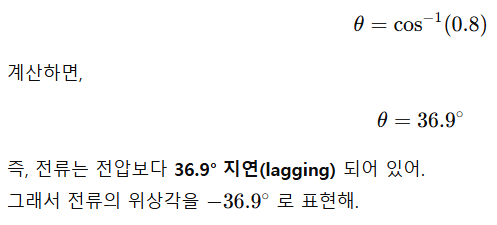 여기 그래프를 보면 **파란색 선(전압)**이 기준이고, **빨간색 선(전류)**이 36.9° 지연된 걸 확인