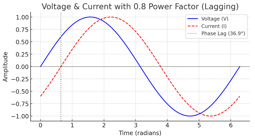 전압과 전류의 위상 관계 그래프!! 역률이 0.8일 때 전류가 전압보다 36.9° 지연(lagging)