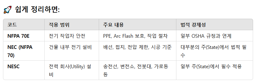 🔥 NFPA 70E vs. NEC vs. NESC 차이점 🔥