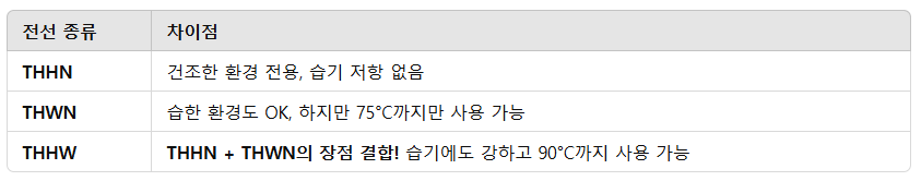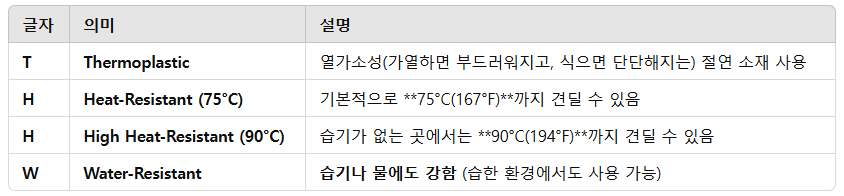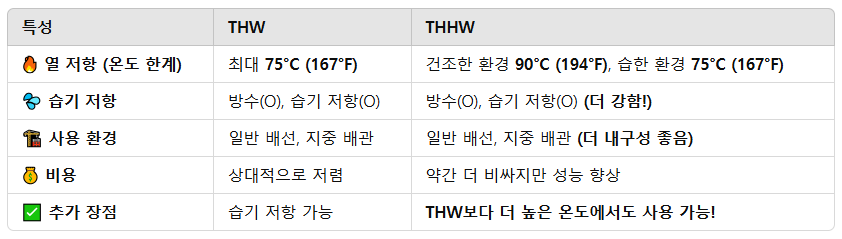 ✔ THHW 👉 THW보다 더 높은 온도(90°C)에서도 사용 가능! 🔥💪