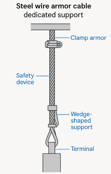 - 스틸 아머 케이블은 특별히 전용 지지 장치를 써야 하고, 아래쪽엔 미끄럼 방지를 위한 안전장치도 설치 가능해요.