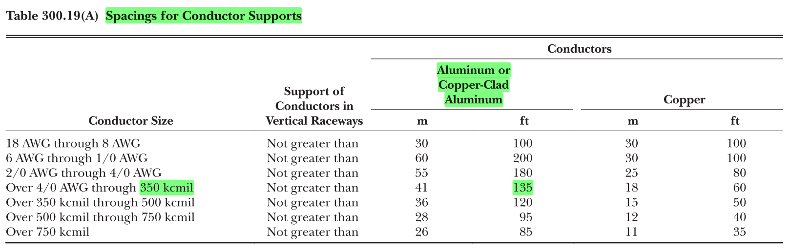 Conductors in vertical raceways shall be supported if the vertical rise exceeds the values in Table 300.19(A).