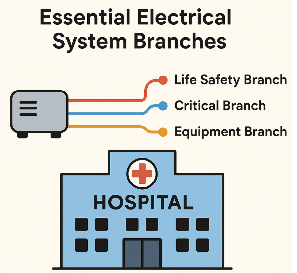 Essential electrical systems for hospitals shall be comprised of three separate branches capable of supplying a limited amount of lighting and power service that is considered essential for life safety and effective hospital operation during the time the normal electrical service is interrupted for any reason.