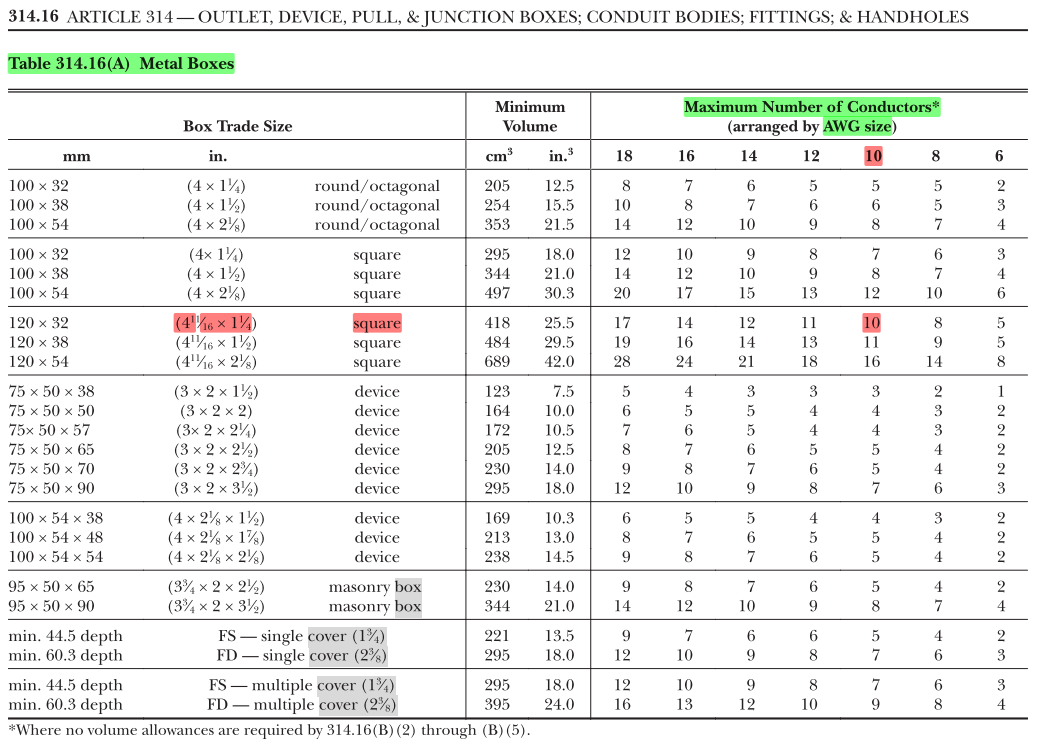 314.16 Number of Conductors in Outlet, Device, and Junction Boxes, and Conduit Bodies.